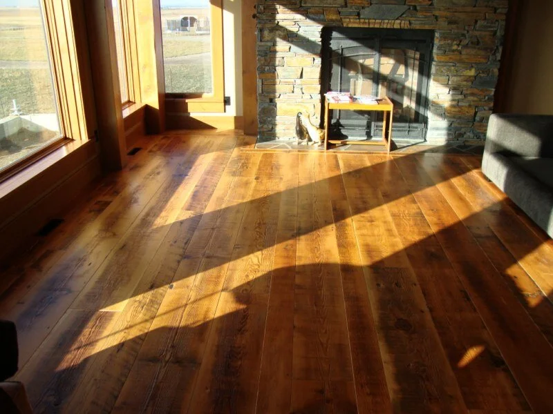 Stunning random width reclaimed Douglas Fir floors can be installed over radiant heat if done properly. These are in a Strathmore, Alberta timberframe home.